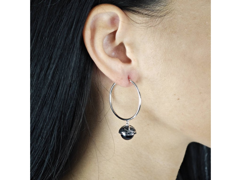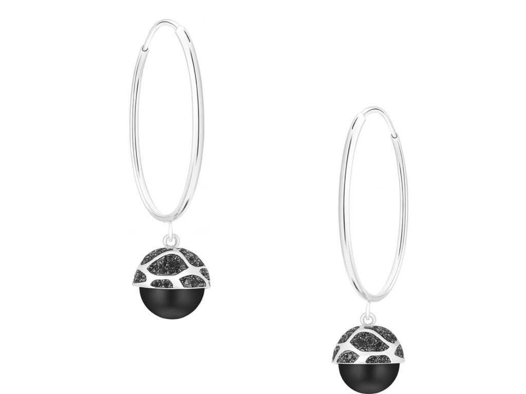 Ich dizajn v sebe spája minimalistický kruh s decentne zavěšenými čiernymi perlami, ktoré zdobí strieborný kryt s jemne štruktúrovaným povrchom pripomínajúcim hviezdnu oblohu.