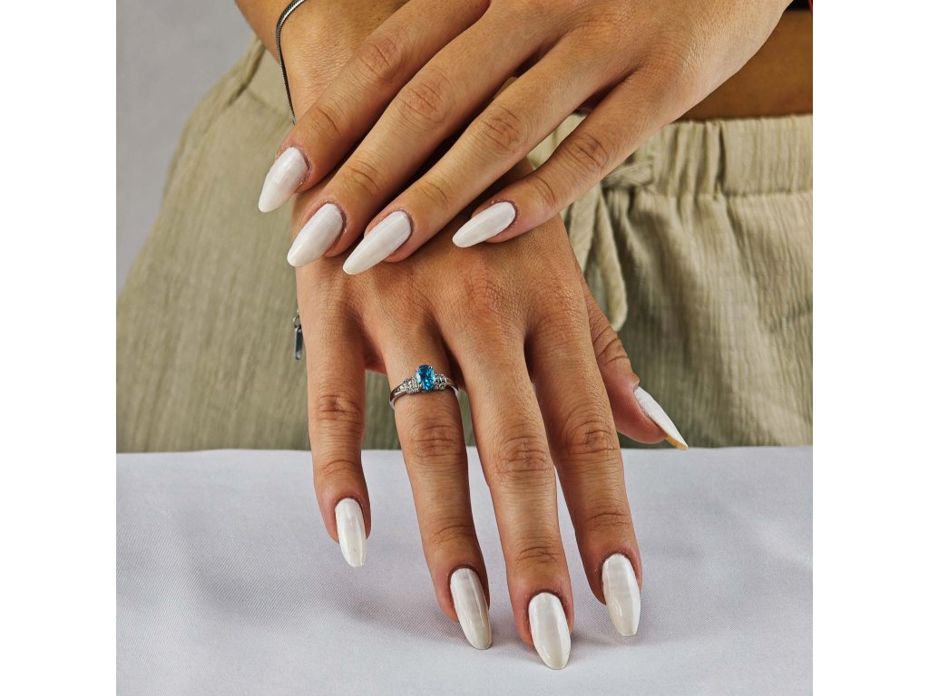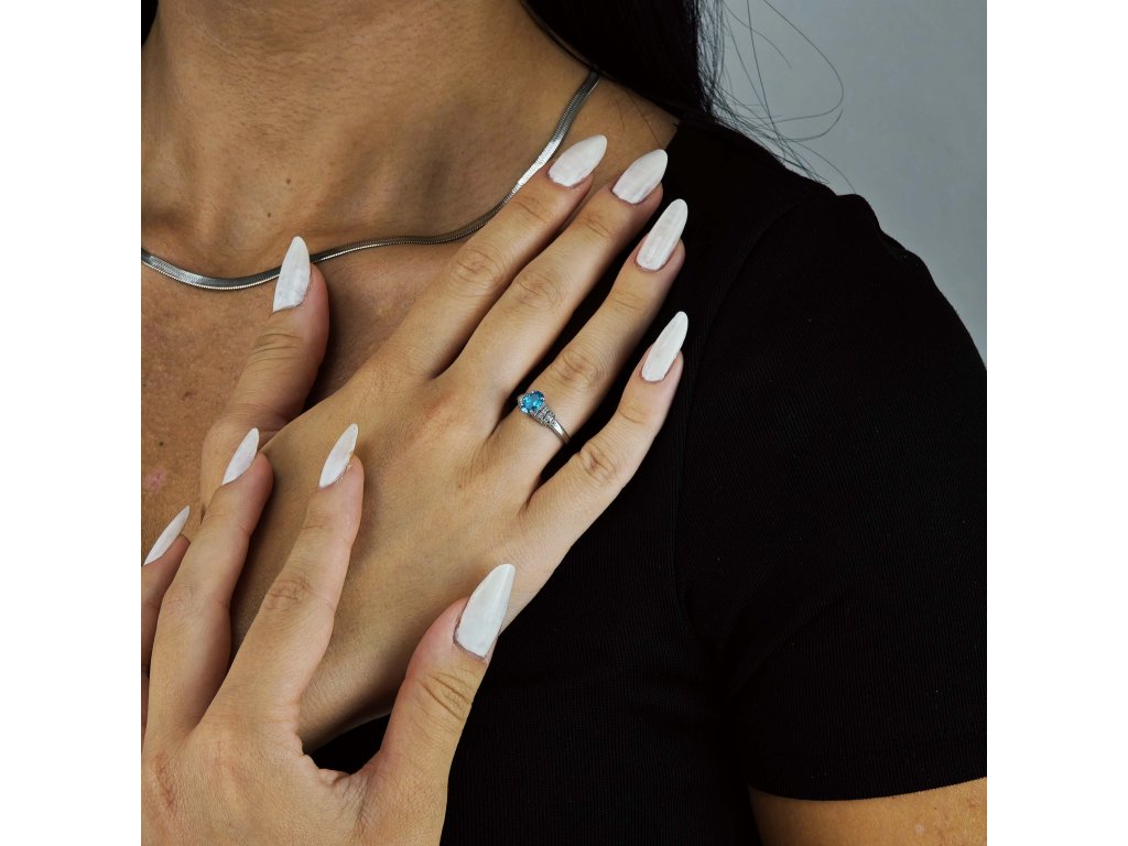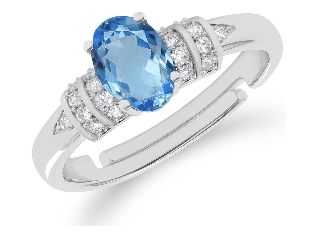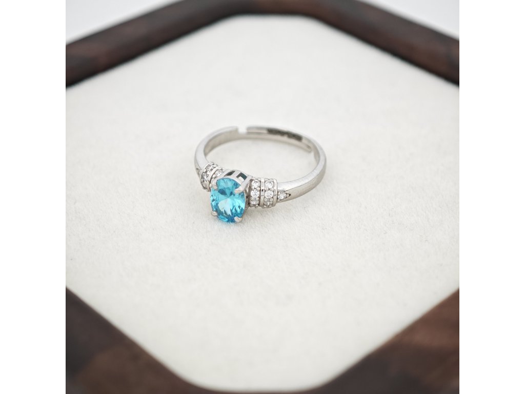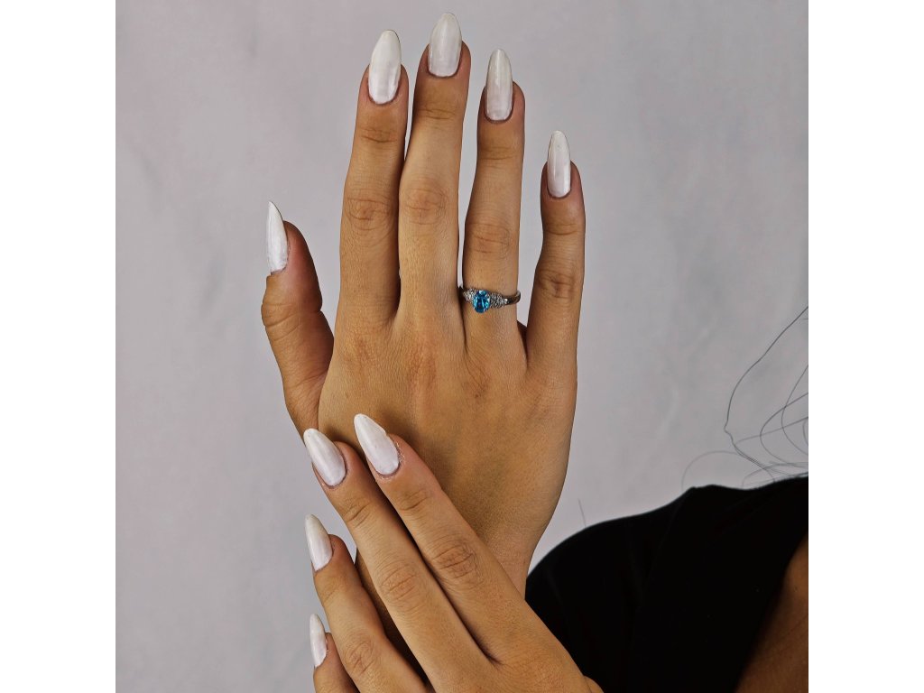 Jeho dominantou je oválny švajčiarsky zirkón v odtieni oceánskej modrej, ktorý svojou čistotou a leskom pripomína drahý topás.
