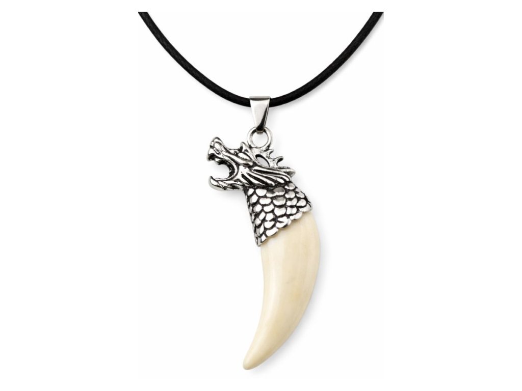 Drak má reliéfne spracované šupiny, otvorenú papuľu a výrazné línie hlavy, ktoré dodávajú prívesku hĺbku. Hladký tesák vytvára kontrast k textúrovanému kovu a zvýrazňuje celkový dizajn. Prívesok je zavesený na čiernej šnúrke, ktorá podčiarkuje surovejší charakter šperku.