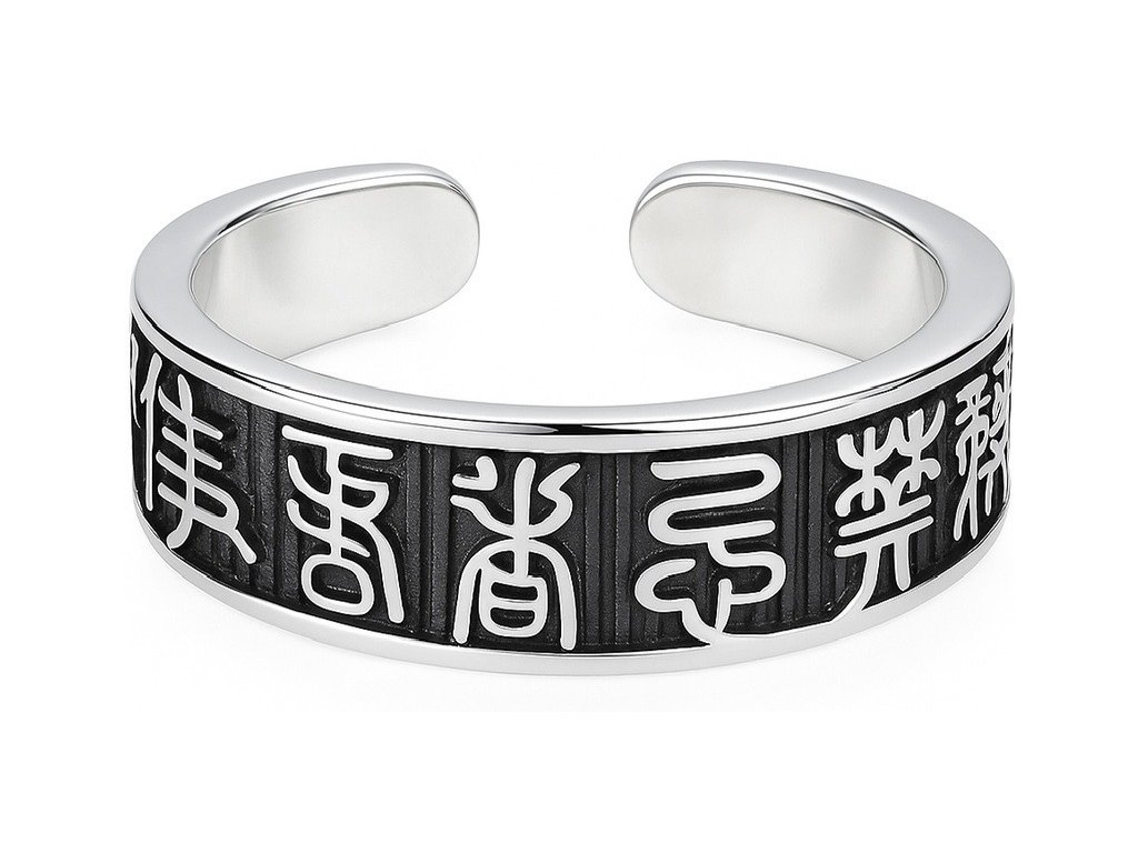 Pánsky prsteň so symbolickými znakmi v orientálnom štýle. Vyjadruje múdrosť, silu a duchovnú rovnováhu pre mužov, ktorí hľadajú zmysel a pokoj.