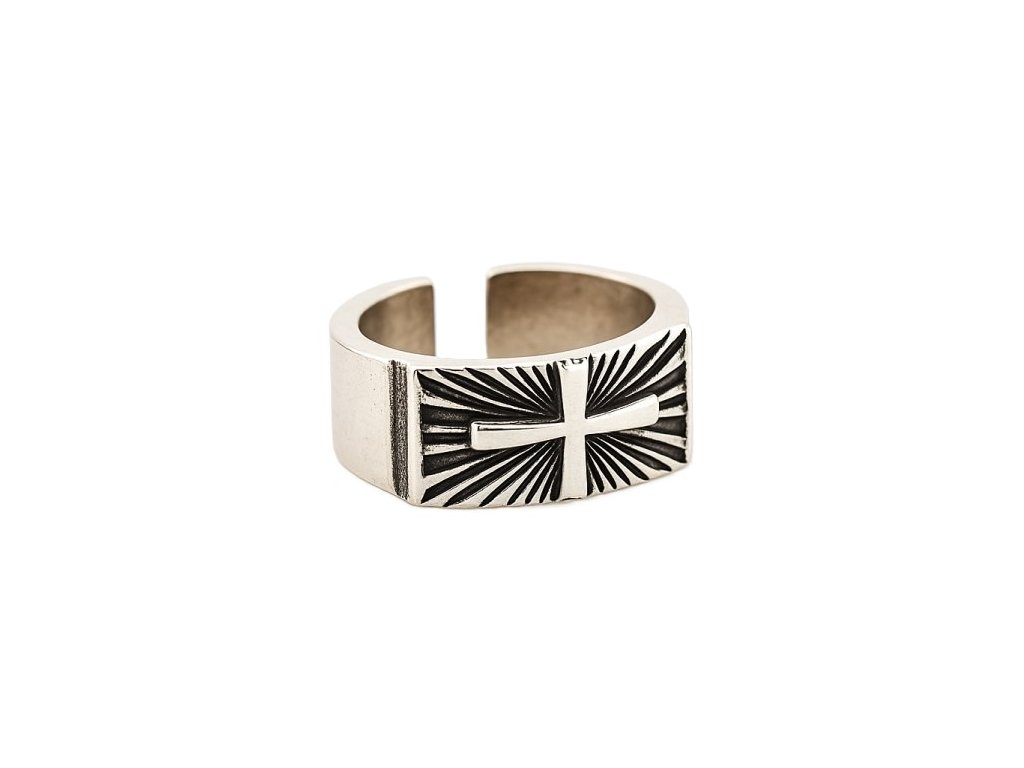 Pánsky nastaviteľný prsteň s vystúpeným motívom kríža, navrhnutý ako výrazný doplnok na každodenné nosenie aj formálnejší štýl.