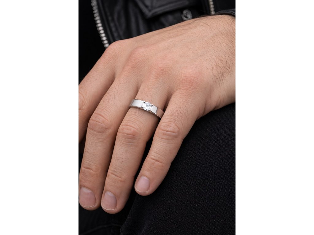 Pánsky prsteň s centrálnym zirkónom a čistým minimalistickým dizajnom, navrhnutý ako elegantný doplnok na každodenné nosenie aj formálnejší štýl.