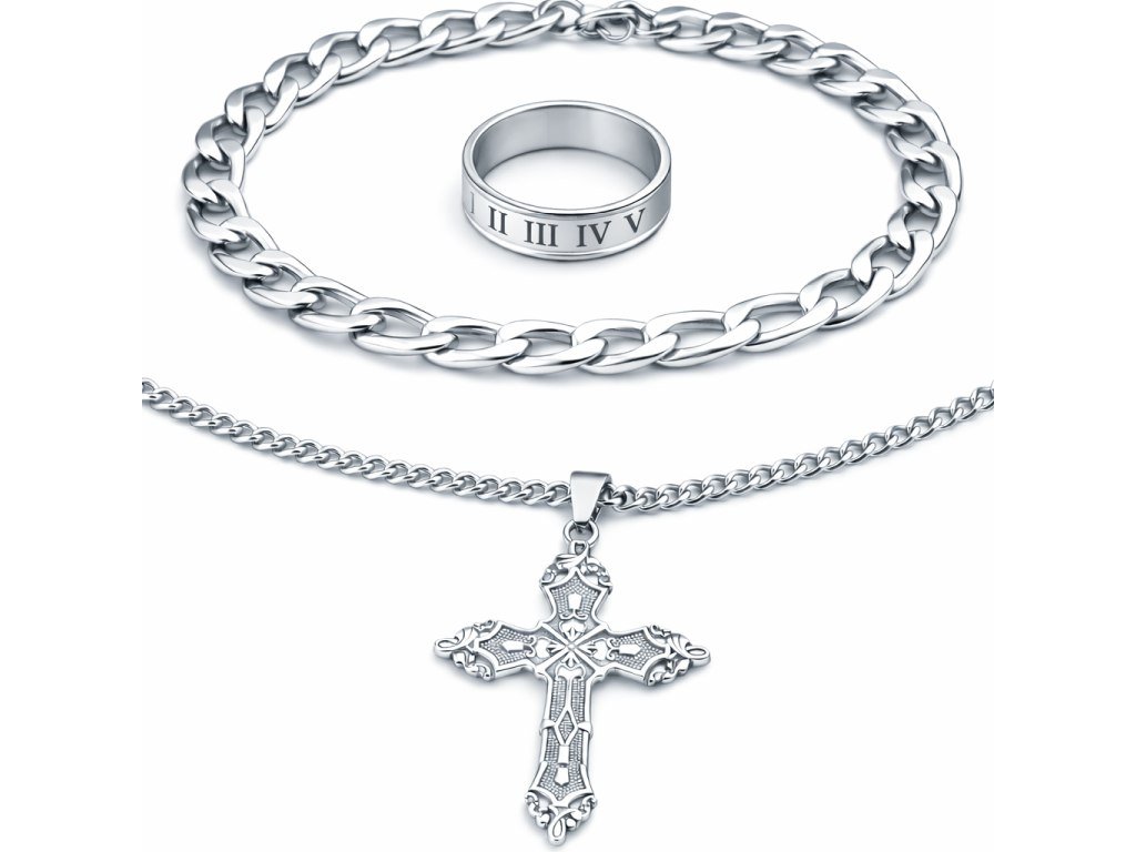 Sacred Unity je prémiový set z chirurgickej ocele 316L, ktorý spája tri silné prvky do jedného harmonického celku: masívnu retiazku s bohato zdobeným krížom, robustný náramok typu Cuban Link a minimalistický prsteň s rímskymi číslicami.