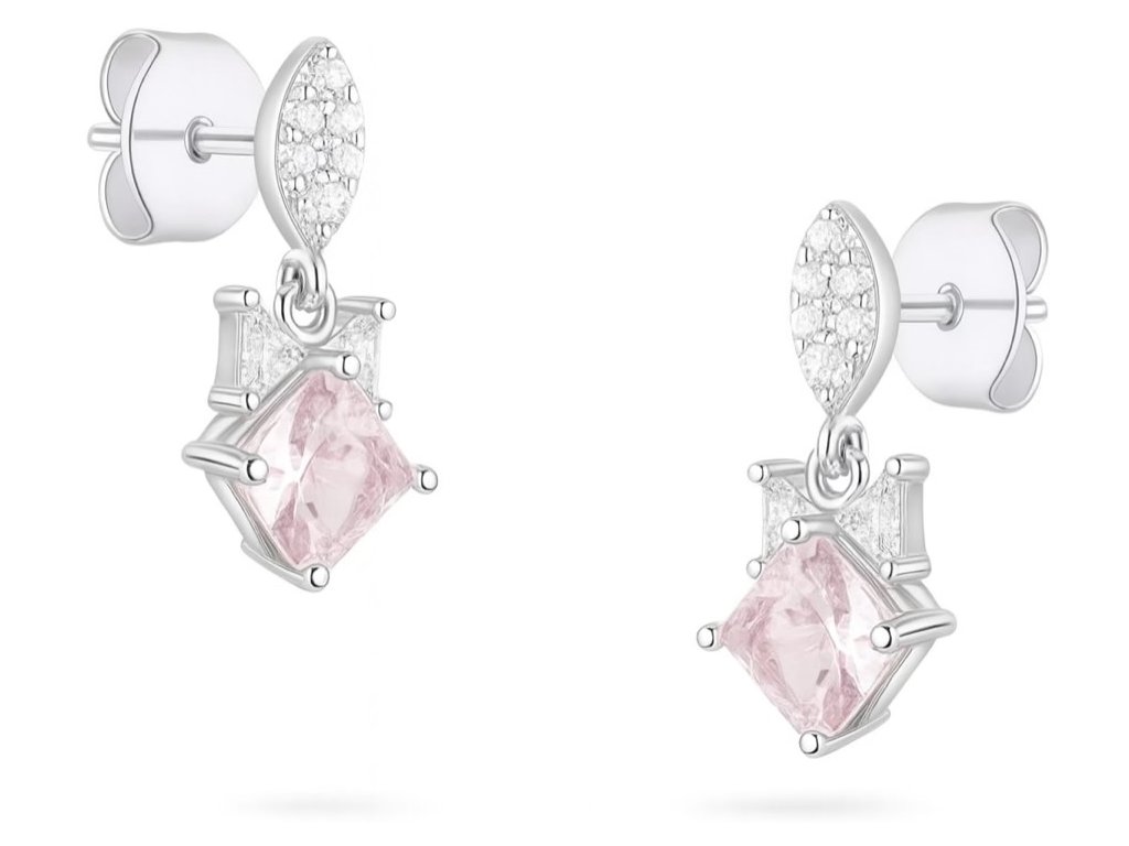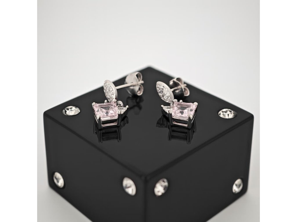 Elegantné strieborné náušnice Starlit Dew s ružovým štvorcovým kameňom a drobnými čírymi zirkónmi, ktoré sa ligocú ako ranná rosa a hviezdy na oblohe.