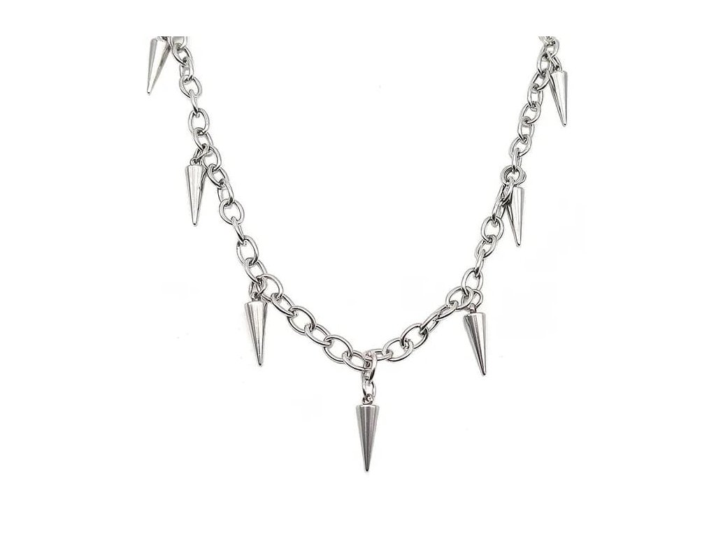 Výrazný oceľový náhrdelník so špicatými príveskami, ktorý symbolizuje silu, odvahu a nezávislosť. Ideálny pre tých, ktorí sa neboja vyniknúť.