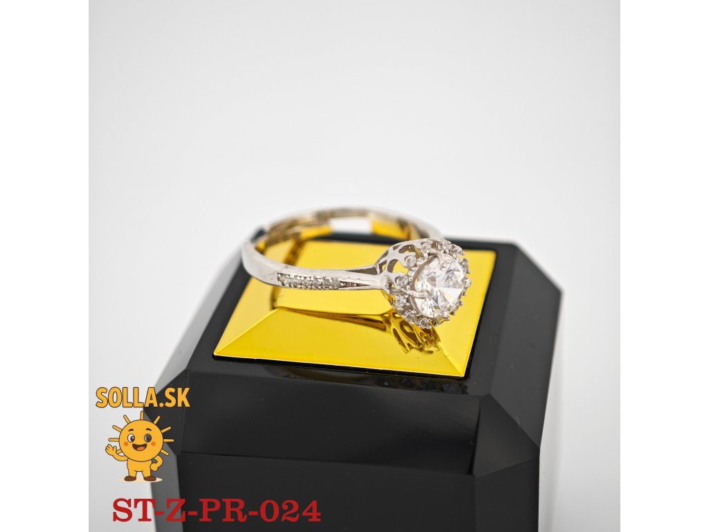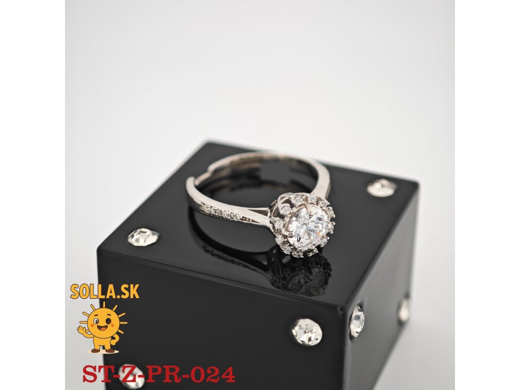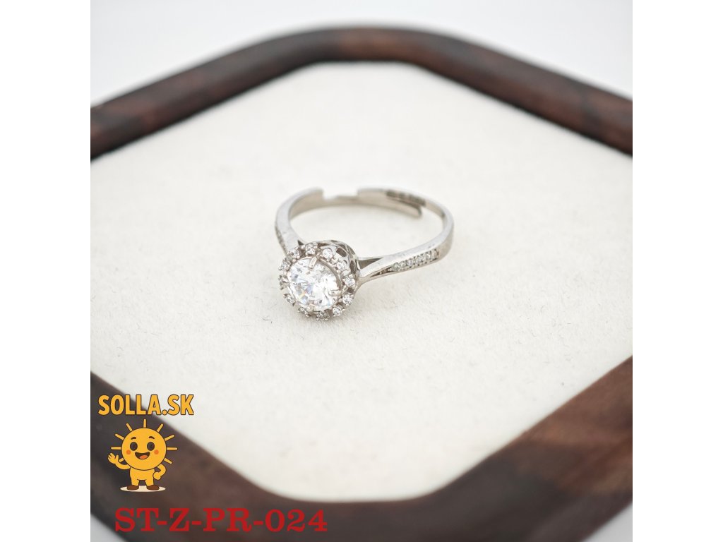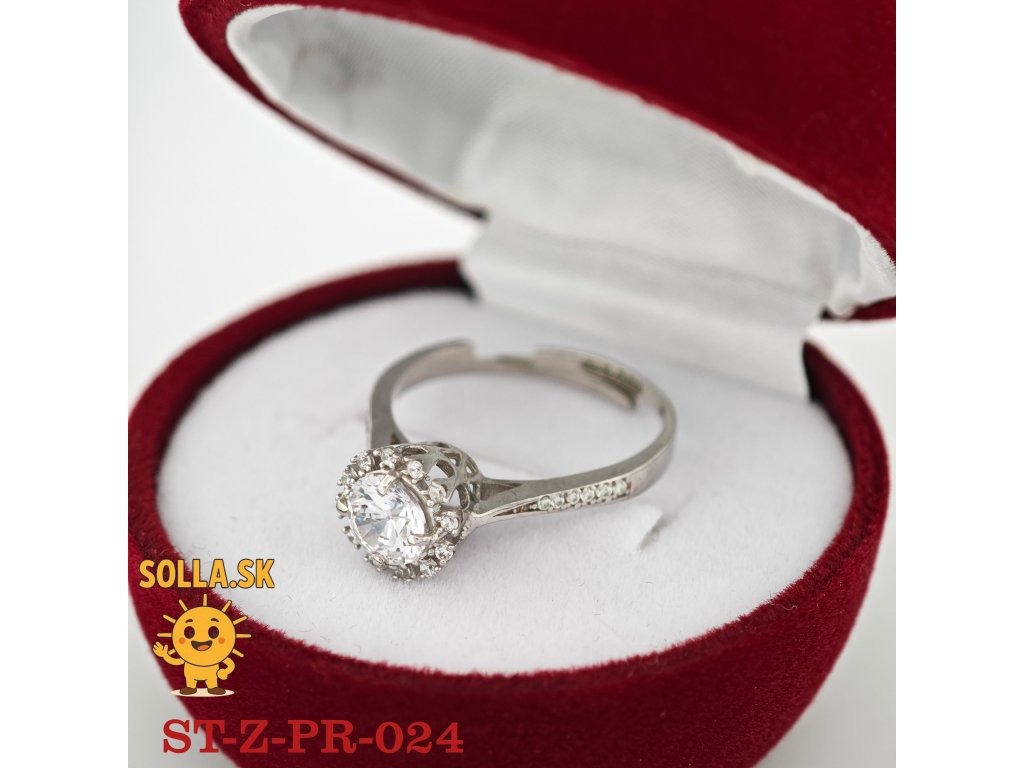 Jeho dominantným prvkom je brilantne brúsený švajčiarsky zirkón v podobe hviezdneho rozkvetu, obklopený jemným halo iskrivých kamienkov a doplnený drobnými zirkónmi na ramenách prsteňa. Tento prepracovaný dizajn vytvára dojem žiary a elegancie, ktorý pôsobí mimoriadne sofistikovane.