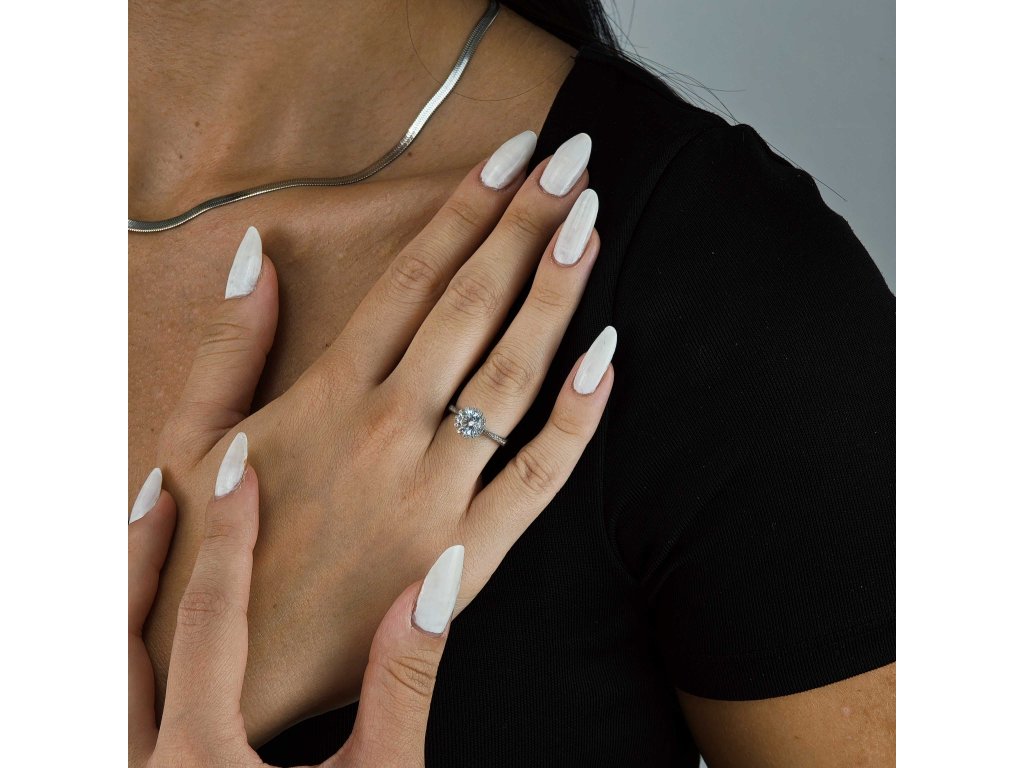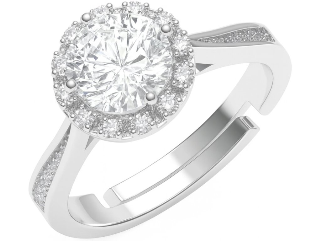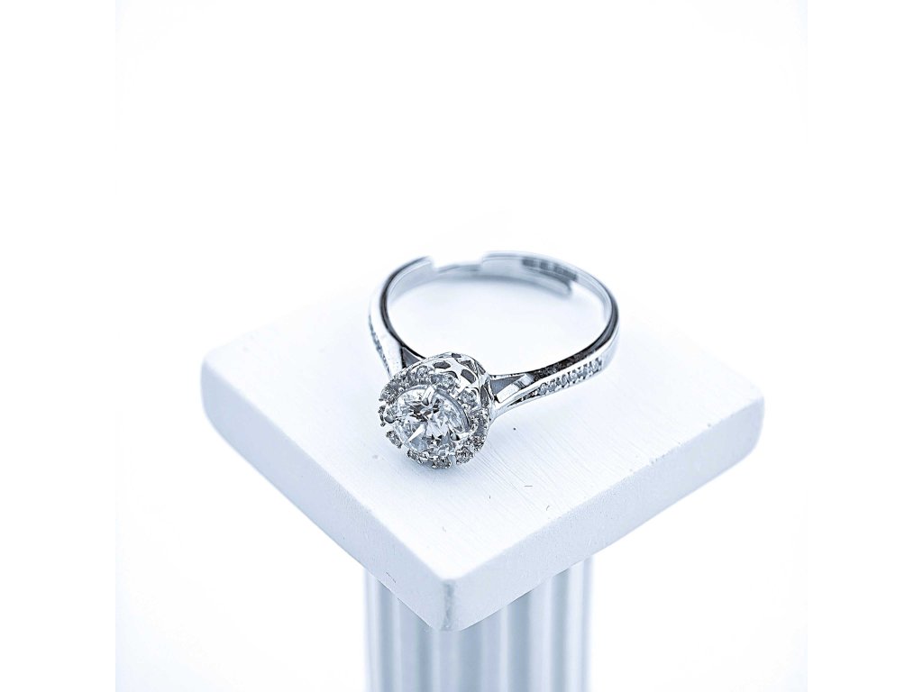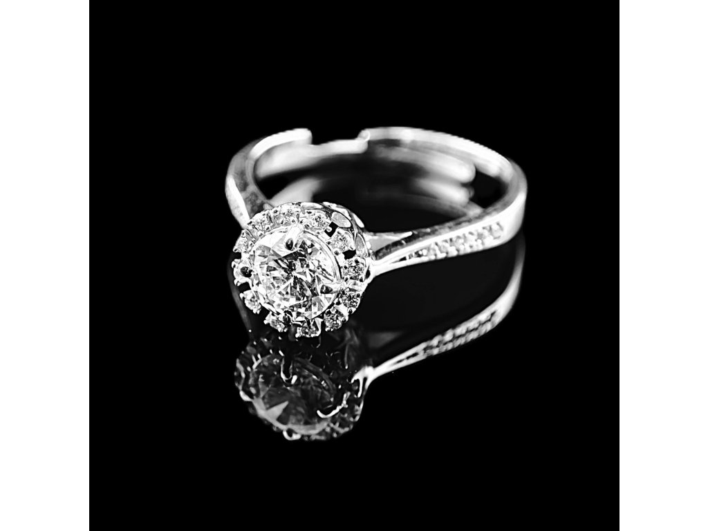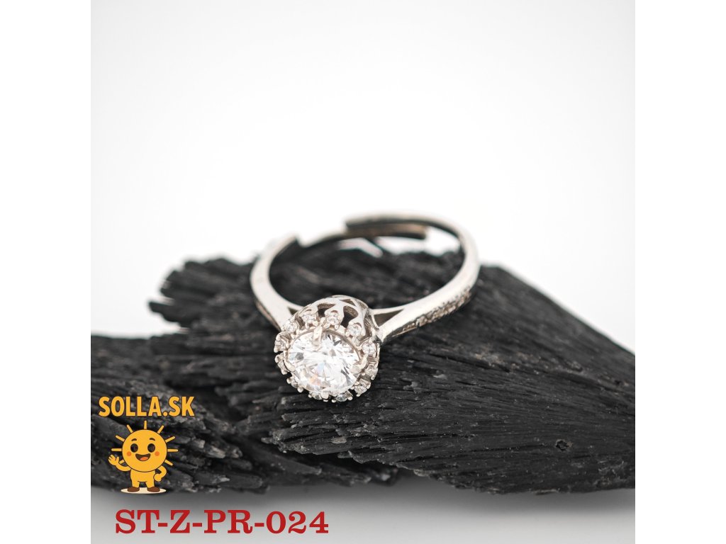 Jeho dominantným prvkom je brilantne brúsený švajčiarsky zirkón v podobe hviezdneho rozkvetu, obklopený jemným halo iskrivých kamienkov a doplnený drobnými zirkónmi na ramenách prsteňa. Tento prepracovaný dizajn vytvára dojem žiary a elegancie, ktorý pôsobí mimoriadne sofistikovane.