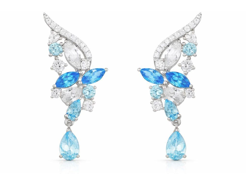 Náušnice zdobia modré a číre zirkóny rôznych tvarov, ktoré sú usporiadané do rozvinutého dekoratívneho motívu. Kombinácia farieb a tvarov vytvára zaujímavý kontrast a zvýrazňuje celkový vzhľad šperku. Ľahká konštrukcia zabezpečuje pohodlné nosenie počas dňa.