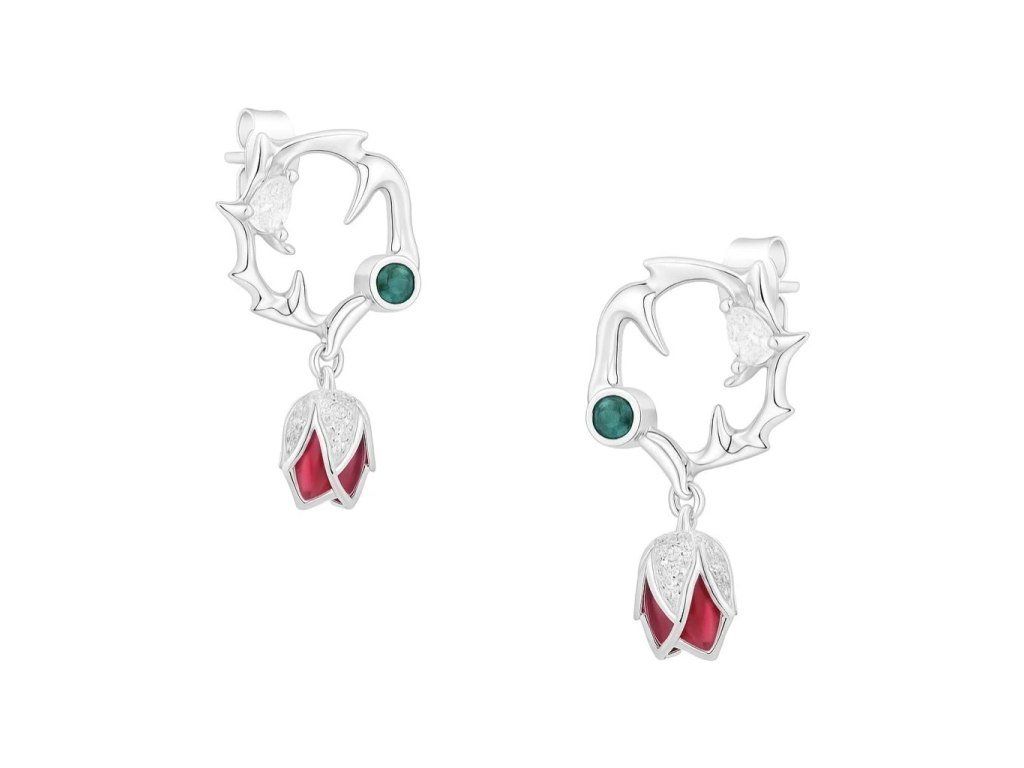 Náušnice sú tvarované do podoby rozvinutého kvetu. V strede sa nachádza červený zirkón, doplnený čírymi zirkónmi usporiadanými pozdĺž lístkov. Kombinácia farieb a tvarov vytvára vyvážený a výrazný vzhľad vhodný na rôzne príležitosti.