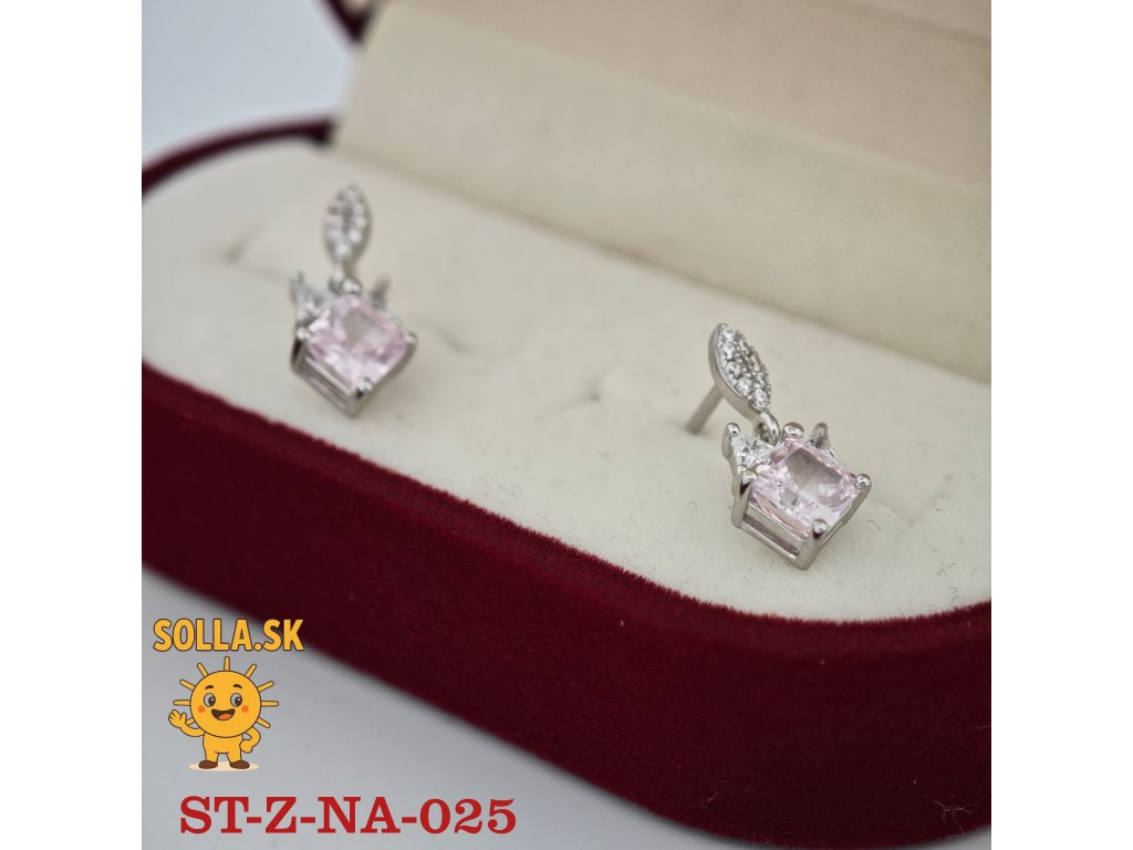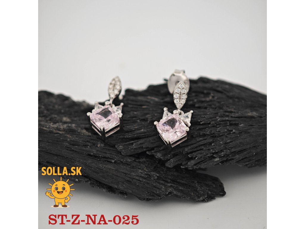 Dominantou náušníc je jemný ružový kameň v tvare štvorca, ktorý sa pri každom pohybe zaleskne ako rosa v prvých lúčoch slnka. Nad ním sa trbliece rad drobných čírych zirkónov, pripomínajúcich hviezdy miznúce na úsvite. Kombinácia ružového tónu a žiarivých zirkónov vytvára harmonický kontrast – romantický, no stále moderný.
