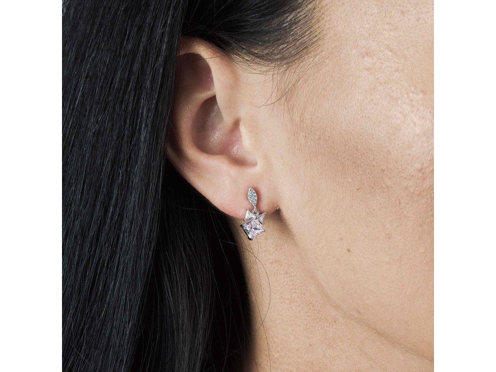 Elegantné strieborné náušnice Starlit Dew s ružovým štvorcovým kameňom a drobnými čírymi zirkónmi, ktoré sa ligocú ako ranná rosa a hviezdy na oblohe.