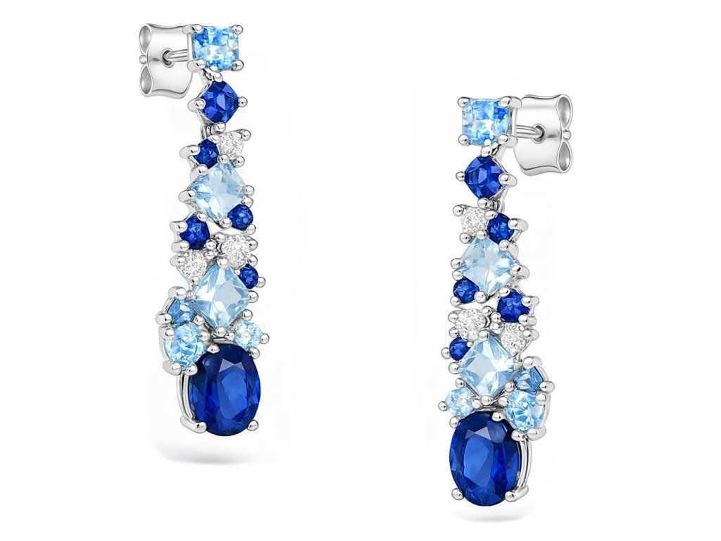 Náušnice zdobia zirkóny v svetlomodrom a tmavšom odtieni, ktoré vytvárajú jemný kontrast. Kamene sú osadené tak, aby zachovávali vyvážený a čistý vzhľad. Vďaka ľahkej konštrukcii sú vhodné na bežné nosenie aj rôzne príležitosti.