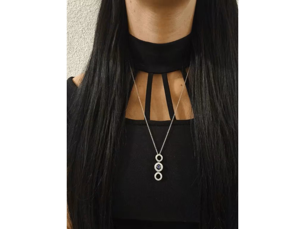 Stredný kruh je ozdobený modrým švajčiarskym zirkónom, ktorý šperku dodáva mystický nádych a pripomína žiarivú hviezdu na nočnej oblohe.