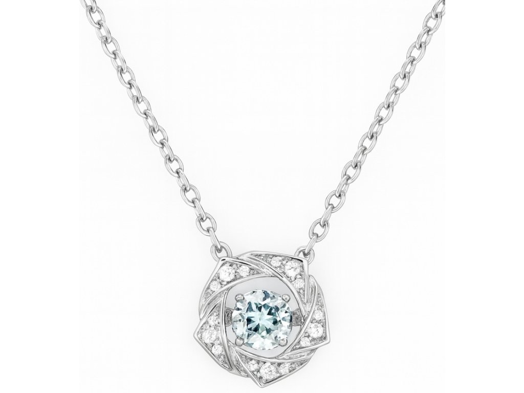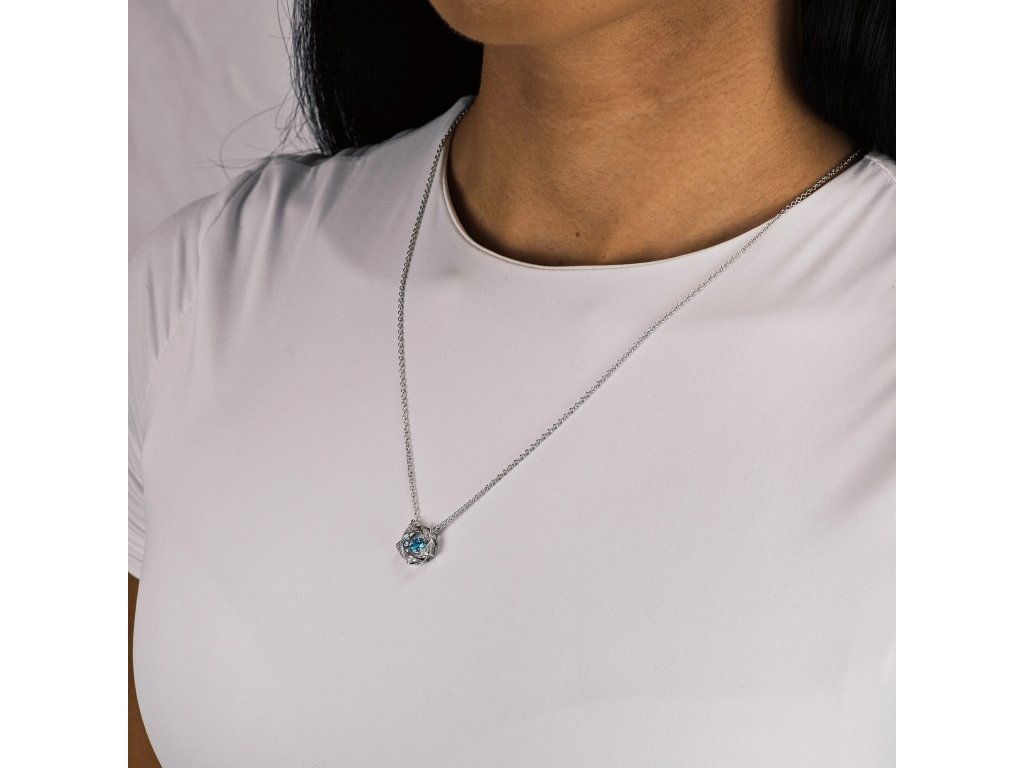 Luna Petalis je náhrdelník z rýdzeho striebra 925 s rhódiovou úpravou, v ktorom sa jemné okvetné lístky vinú okolo svetlom zaliateho modrého zirkónu.