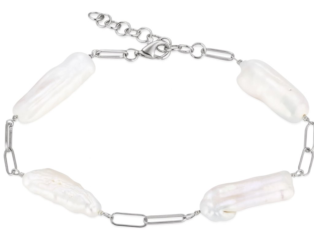 Minimalistické strieborné články vytvárajú vzdušnú kompozíciu, v ktorej každý perlový fragment vyniká ako unikátny dotyk mora.