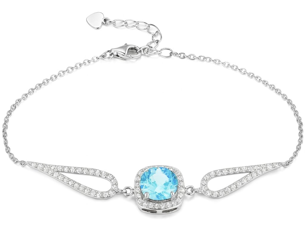 Dominantou šperku je nádherný modrý zirkón v odtieni tyrkysového oceánu, zasadený do precízne zdobeného rámu s drobnými zirkónmi.