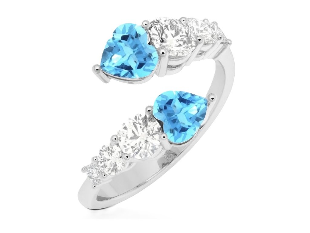 Dominantou prsteňa je srdiečko osadené švajčiarskou zirkóniou s azúrovým odtieňom, ktorej brilancia a jas pripomínajú pravý diamant – žiarivý, čistý a fascinujúci. Bočné zirkóny elegantne dopĺňajú centrálny kameň a pri každom pohybe zachytávajú svetlo, čím vytvárajú magickú hru odleskov – ako odraz slnka na morskej hladine.