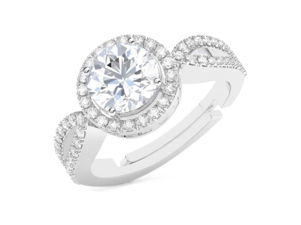 Dominantou prsteňa je číry brúsený zirkón v centrálnej časti, doplnený kruhovým halo osadením drobných kamienkov. Ďalšie zirkóny sú osadené aj na ramenách prsteňa, čím vzniká vyvážený a prehľadný dizajn. Otvorená konštrukcia umožňuje mierne prispôsobenie veľkosti pre pohodlné nosenie.