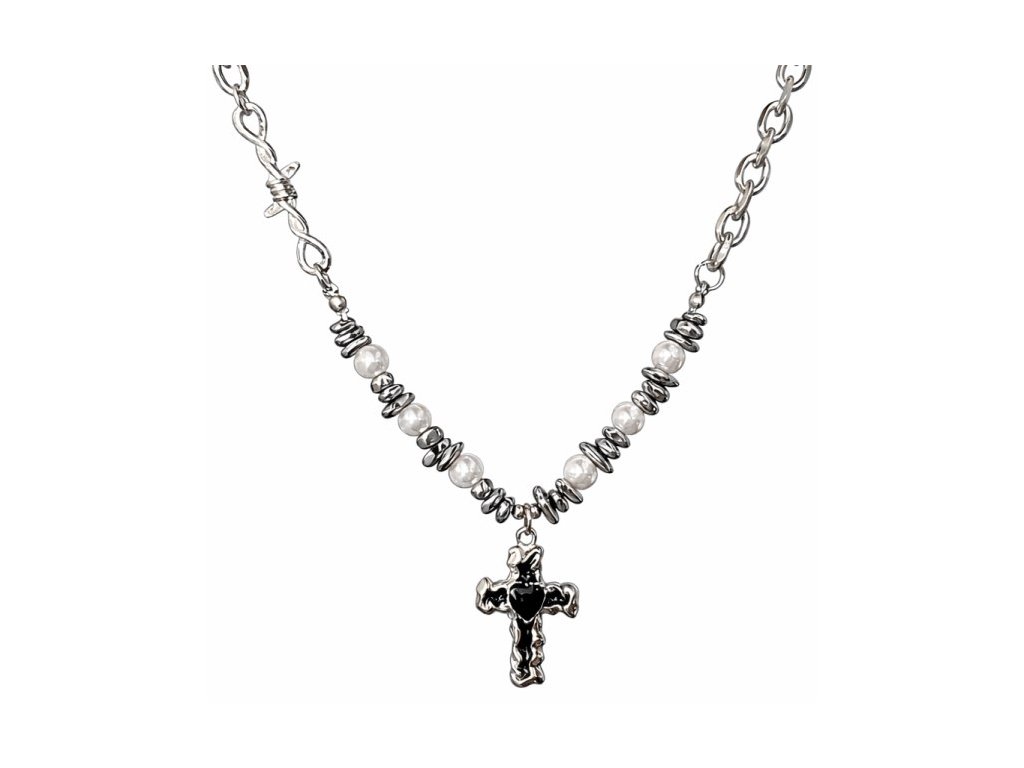 Náhrdelník s krížom, tmavým srdcom a perlovými detailmi