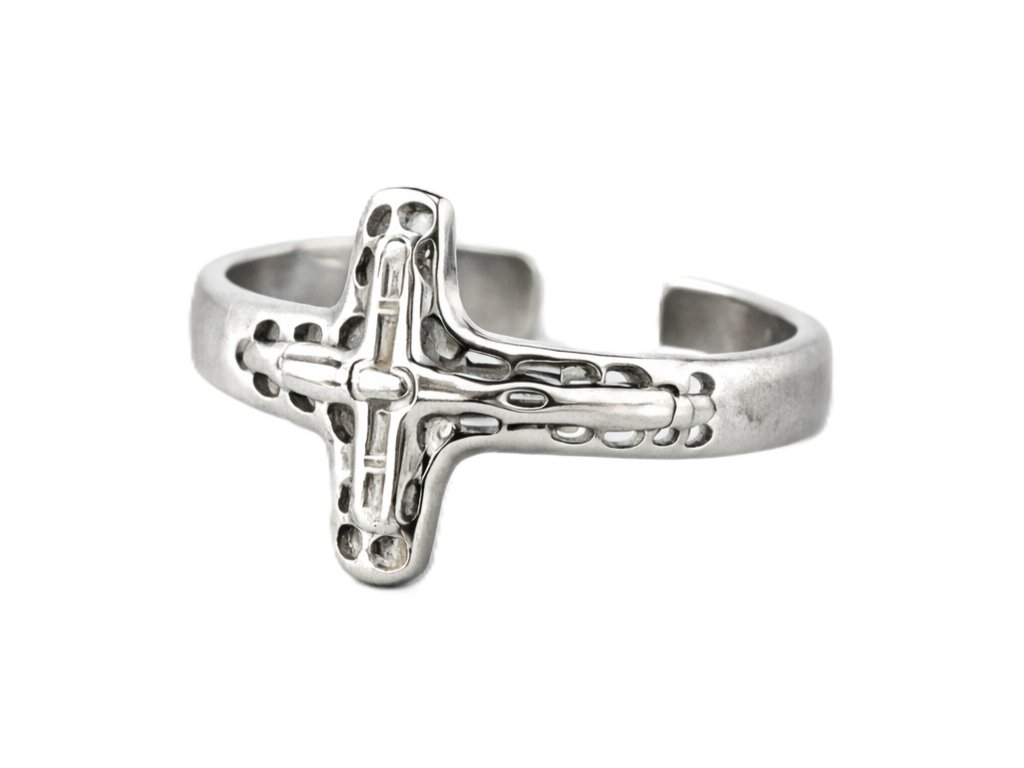 Pánsky nastaviteľný prsteň s reliéfnym motívom kríža, navrhnutý ako jednoduchý doplnok na každodenné nosenie aj formálnejší štýl.