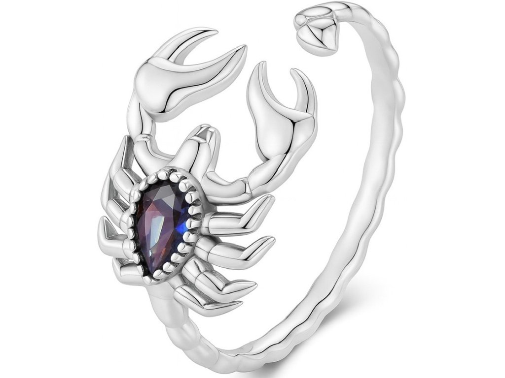Výrazný prsteň z chirurgickej ocele v tvare škorpióna so zirkónom v temne fialovom odtieni. Symbol odvahy, ochrany a nezdolnosti. Nastaviteľná veľkosť pre pohodlné nosenie.